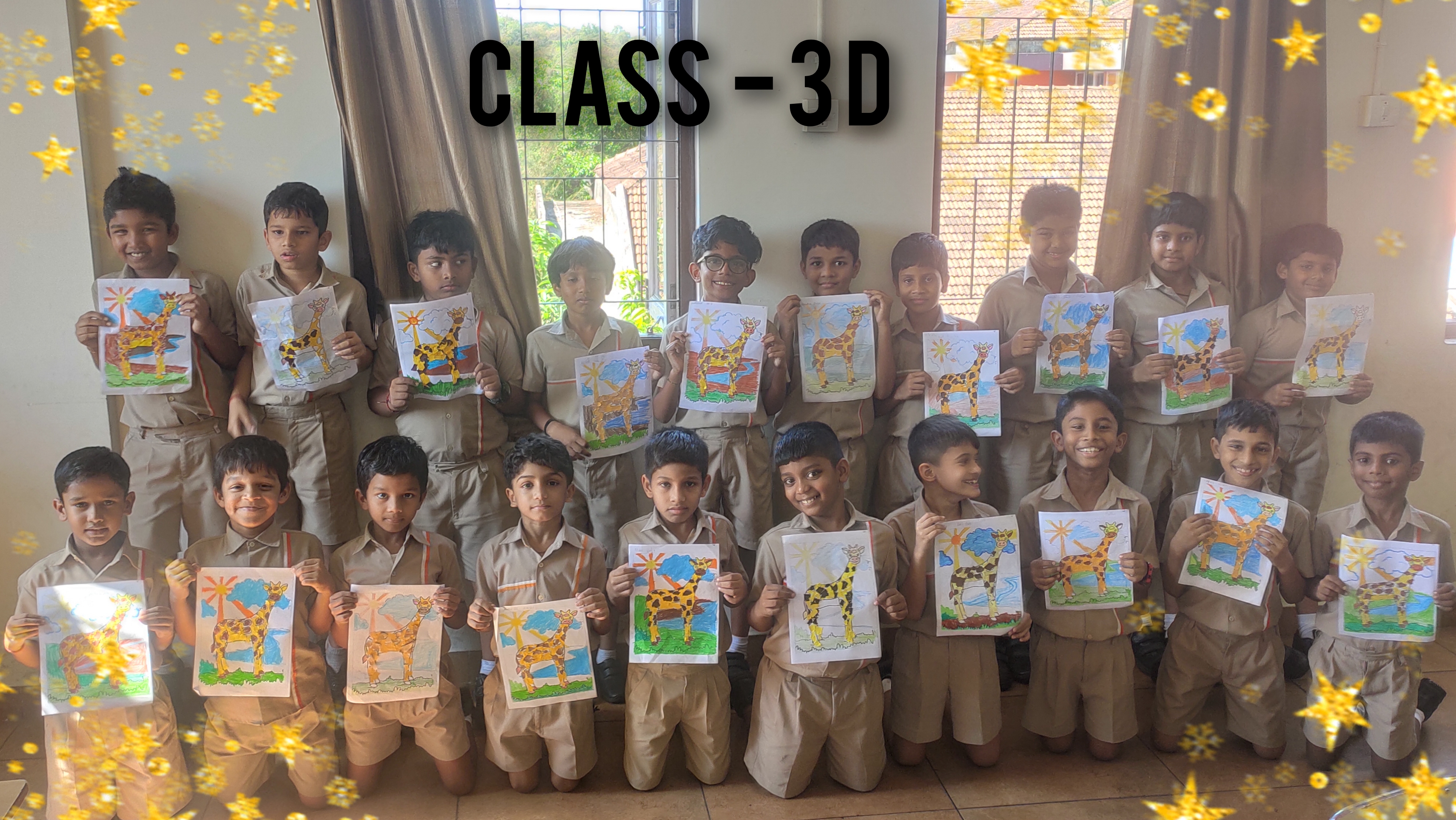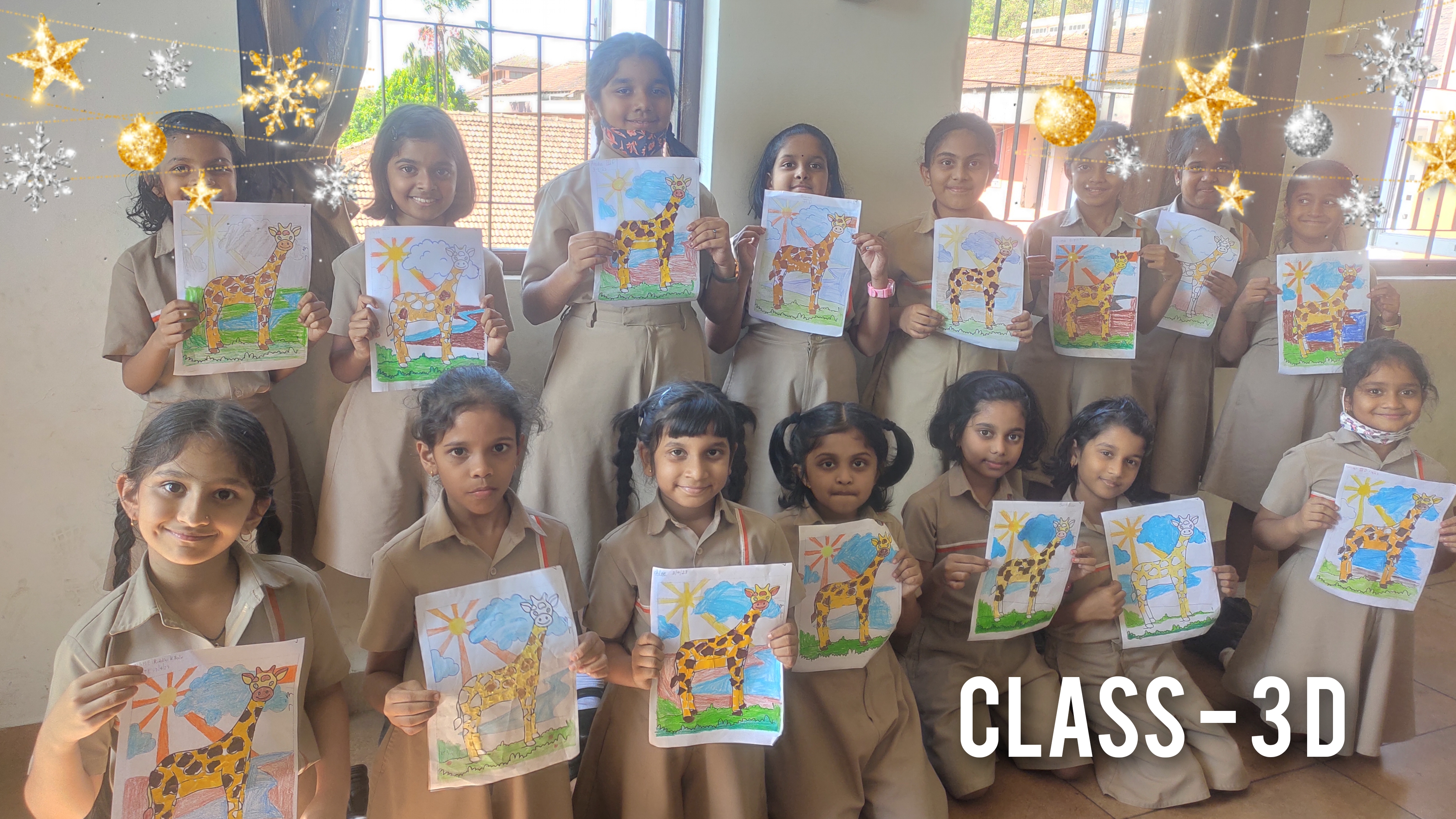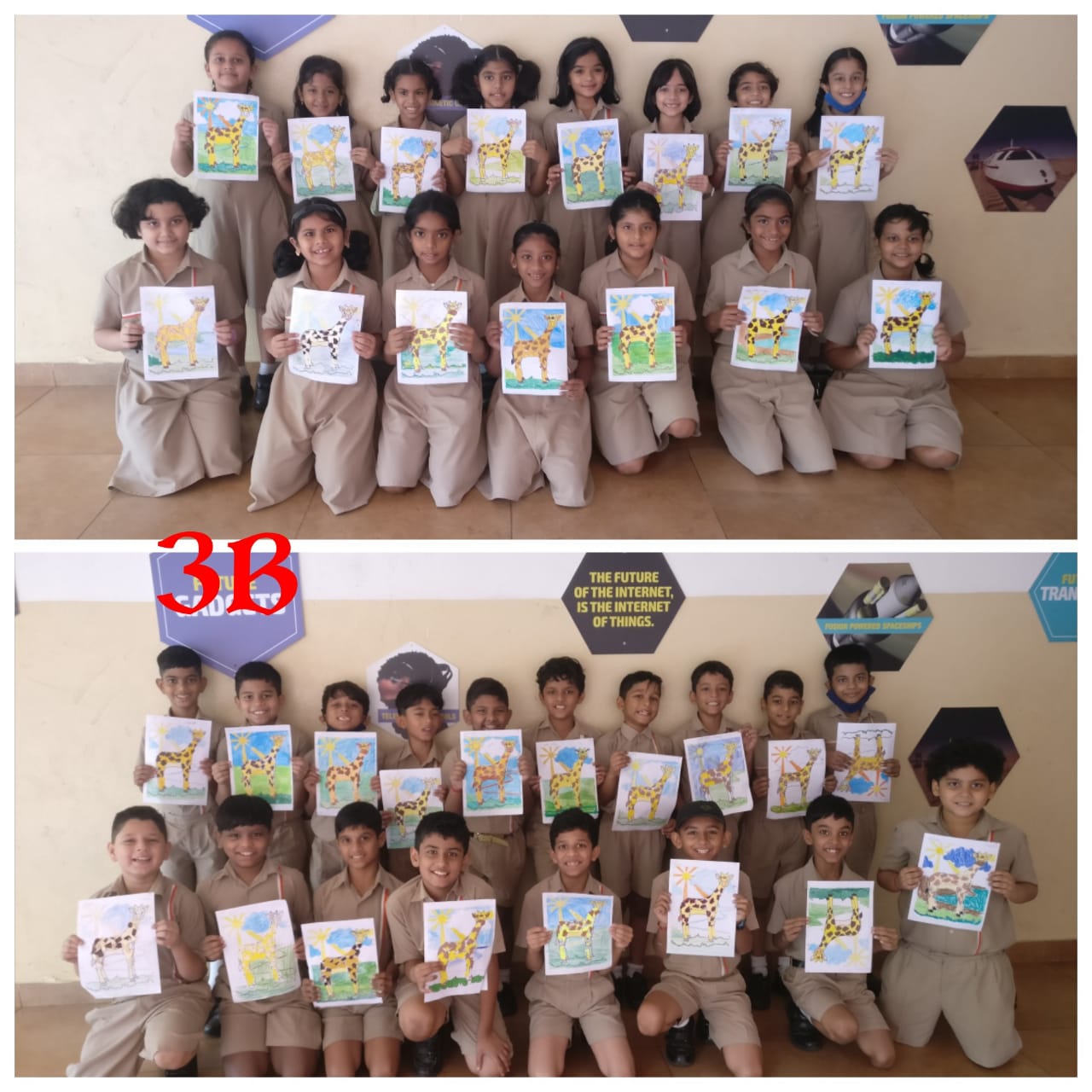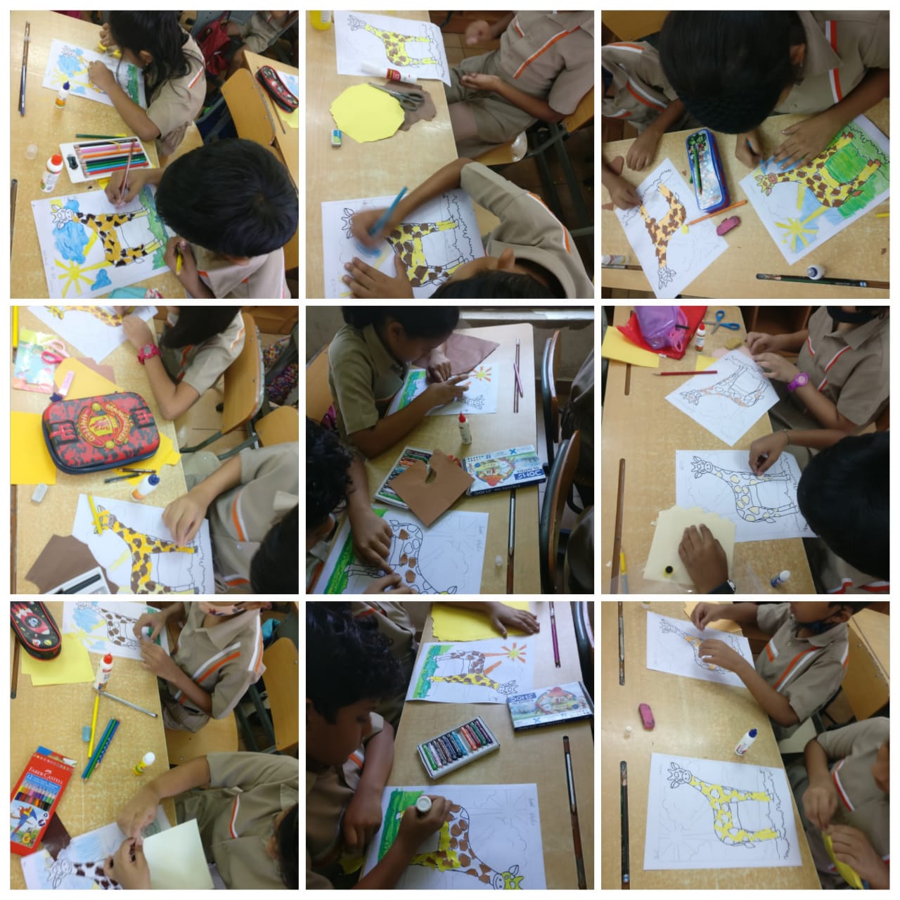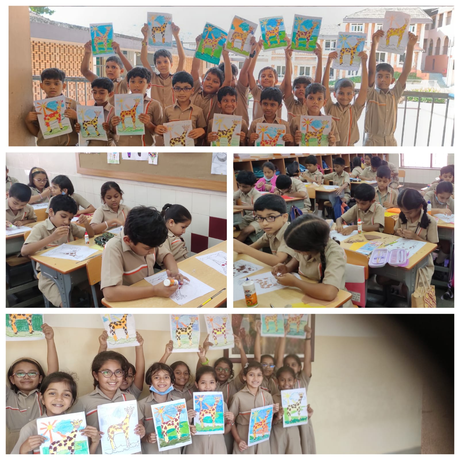 Students were provided with a picture of a giraffe. Using coloured papers through tearing, gluing and assembling method they created the real life version of a giraffe. This activity also encouraged them to share some fascinating facts about giraffes.