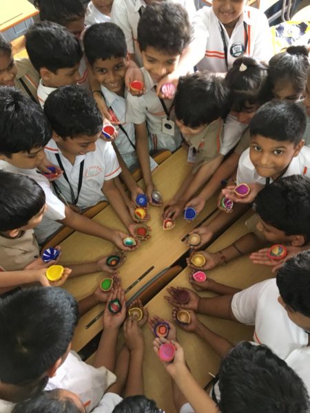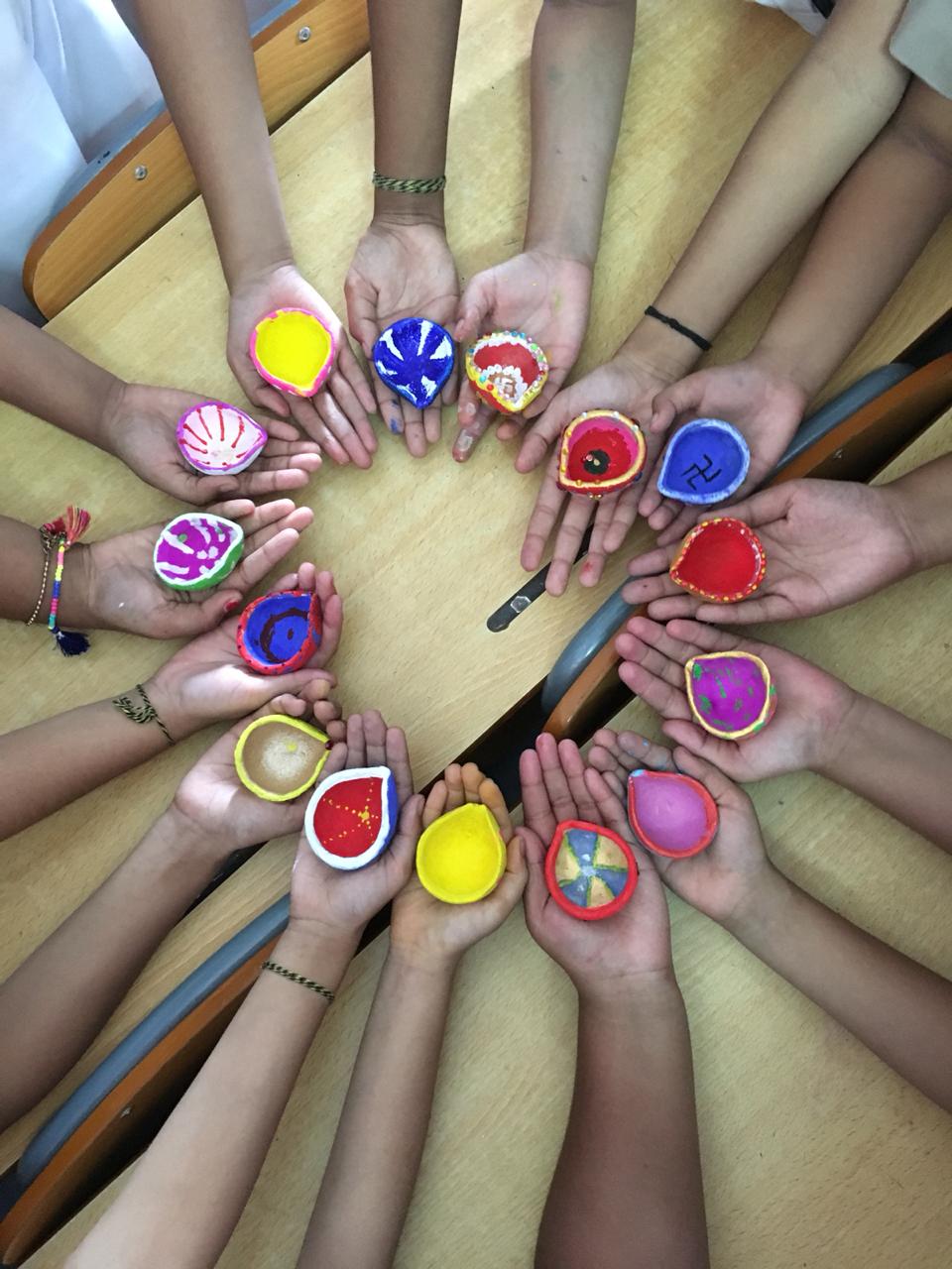 Easy to make diyas for Diwali are a perfect way to get into a festive mood. The students of std 3 did a wonderful job painting their diyas with bright colours and decorating them with pearls that shine beautifully, when the diyas are lit up. Diyas, or clay lamps, are traditional lamps used for special occasions in many religions. These lamps are widely used especially during Diwali. On this special day, people light their homes with diyas to welcome the festive spirit.