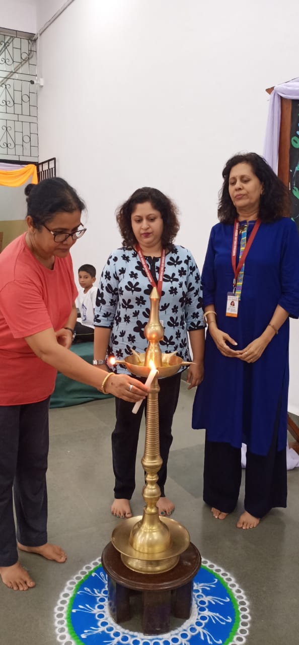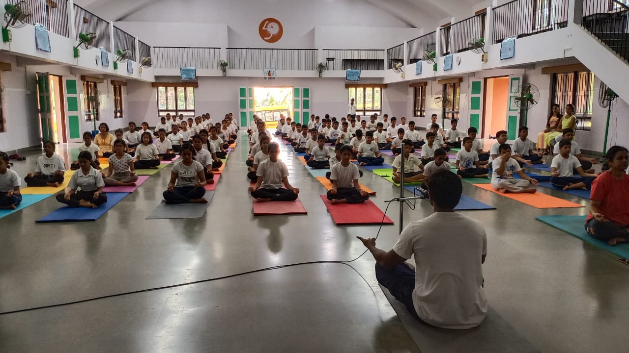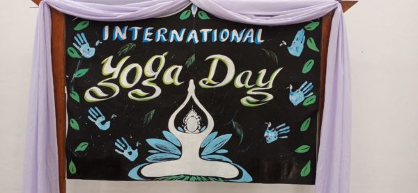 The programme commenced with the lighting of the lamp by the principals of the different sections. The detailed introduction of the fourth International Yoga Day was made by Miss- Saanvi Kamat of Std VI A, followed by a small speech on Yoga by the Principal of the Secondary School Section Smt. Srabonee Thakar.