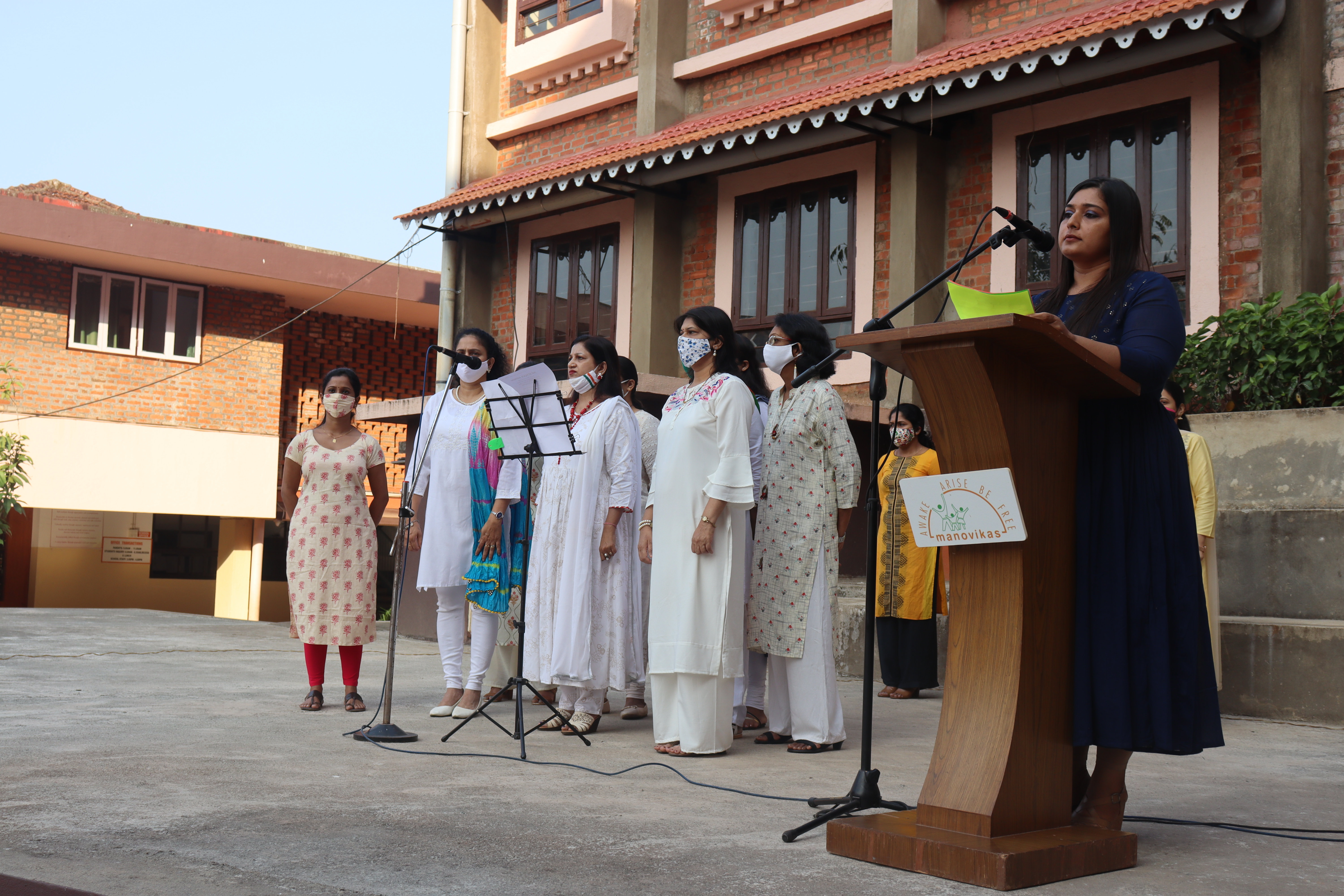Tr. Annapurna Vengurlekar led the gathering with the National Pledge, an oath to make us aware of our duties towards our nation. The Preamble of the Constitution of India was read by Tr. Ashodi M.G. and the Manovikas School Pledge, its pride and glory was read by Tr. Swizel Mascarenhas. Tr. Bina Mishra added colour to the program with a patriotic poem in Hindi.