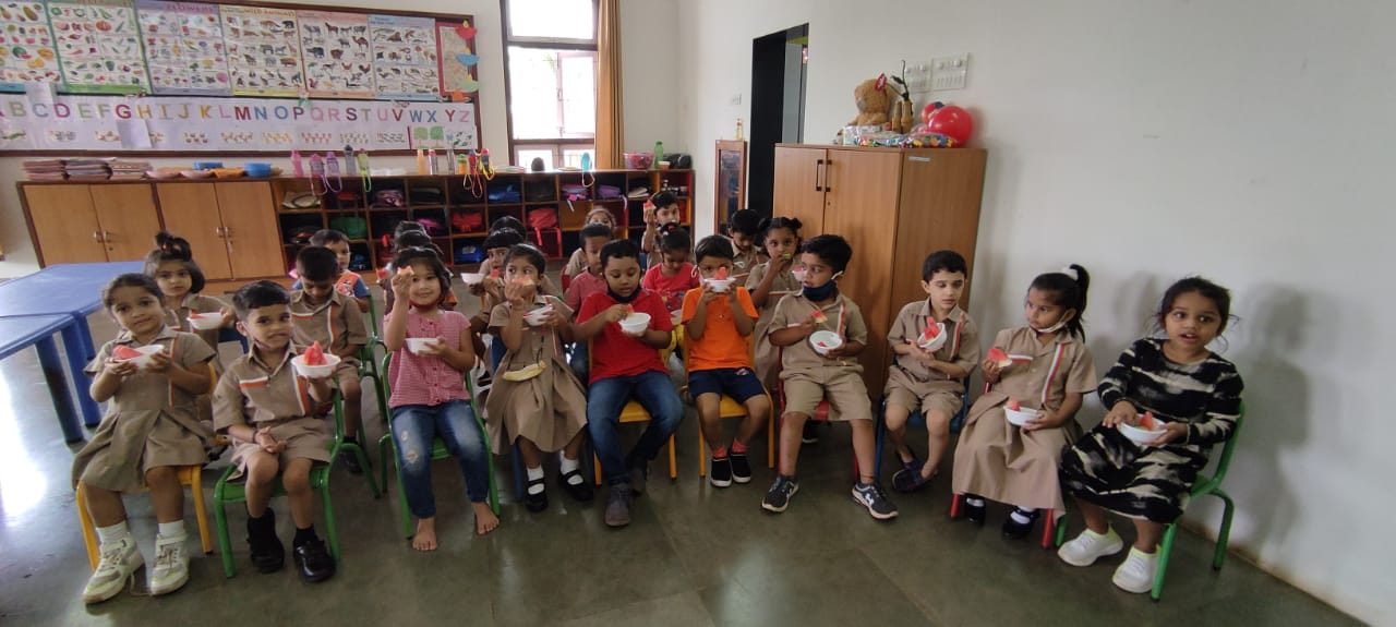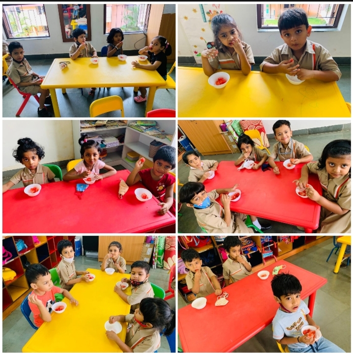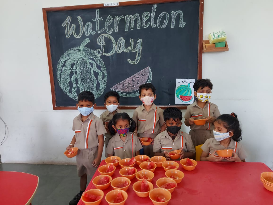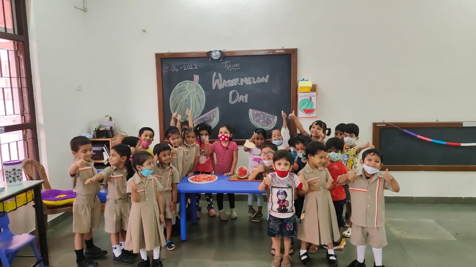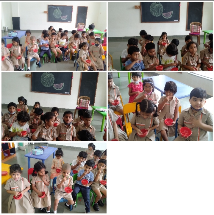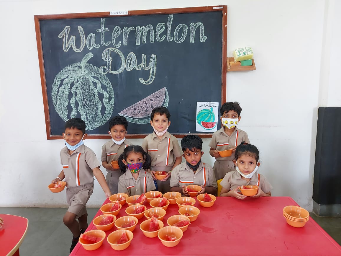 The children of pre-primary inter section enjoyed their watermelon day.The children relished the watermelon during this summer season.