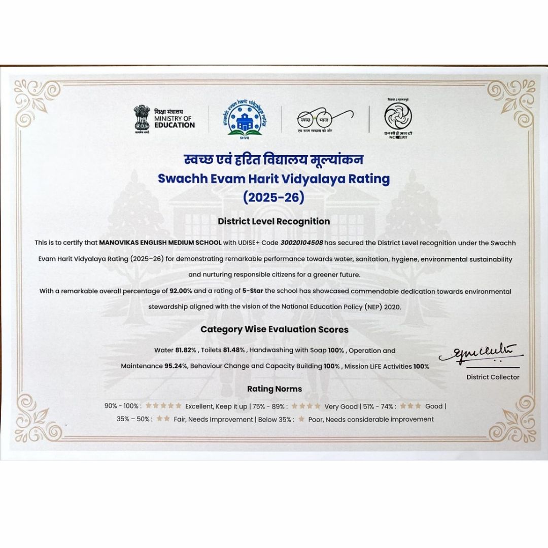 Manovikas English Medium School has been awarded a β 5-Star Rating in the Swachh Evam Harit Vidyalaya Rating (SHVR) 2025β26, securing both State/UT Level and District Level Recognition with an outstanding 92% overall score. This milestone reflects strong commitment to cleanliness, hygiene, sustainability, and nurturing responsible citizens for a greener future. πβ¨ π Congratulations to dedicated staff, students, and management for this remarkable accomplishment! #shvr2025 #5starschool #greencampus #swachhvidyalaya #proudmoment #manovikasenglishmediumschool #sustainability