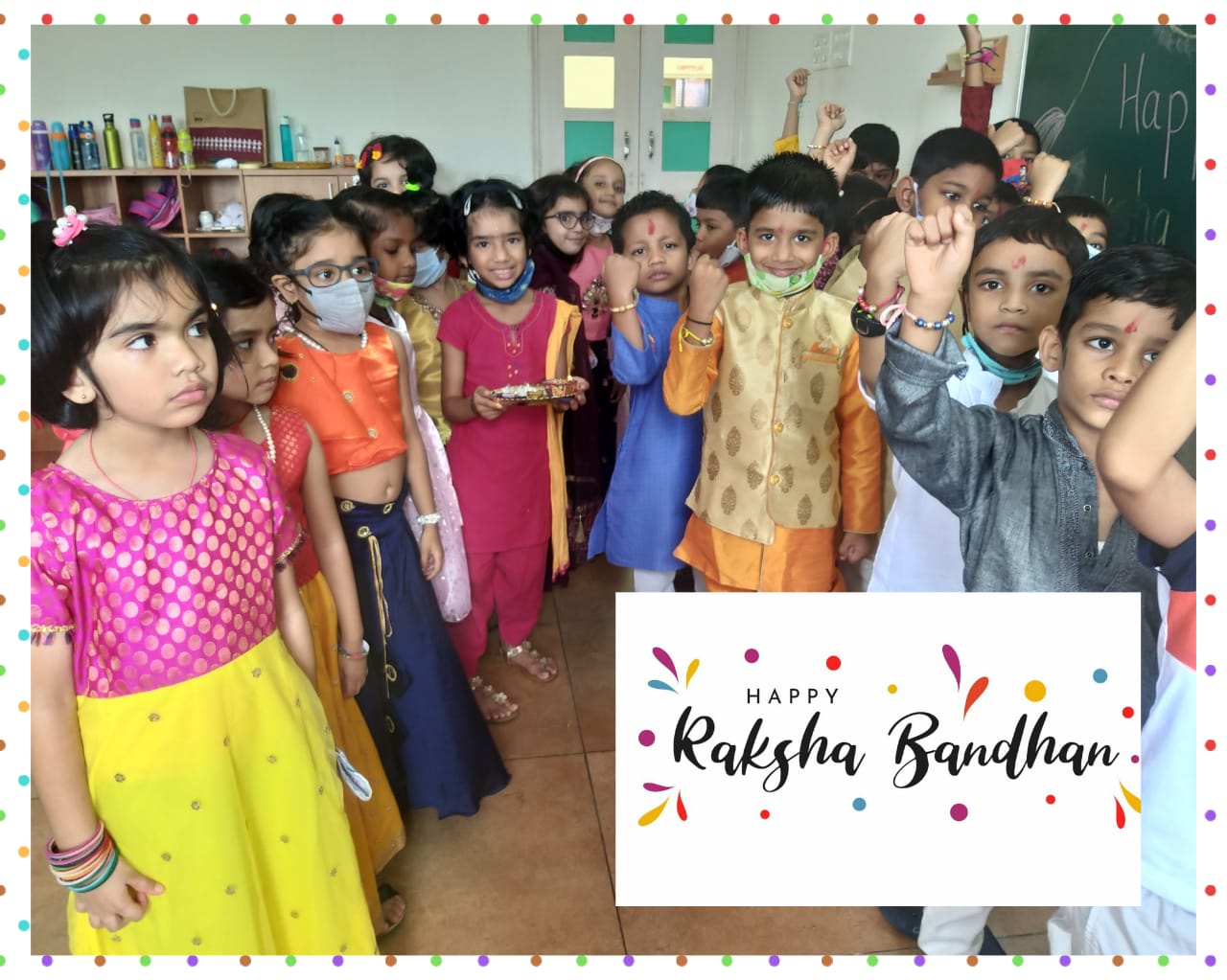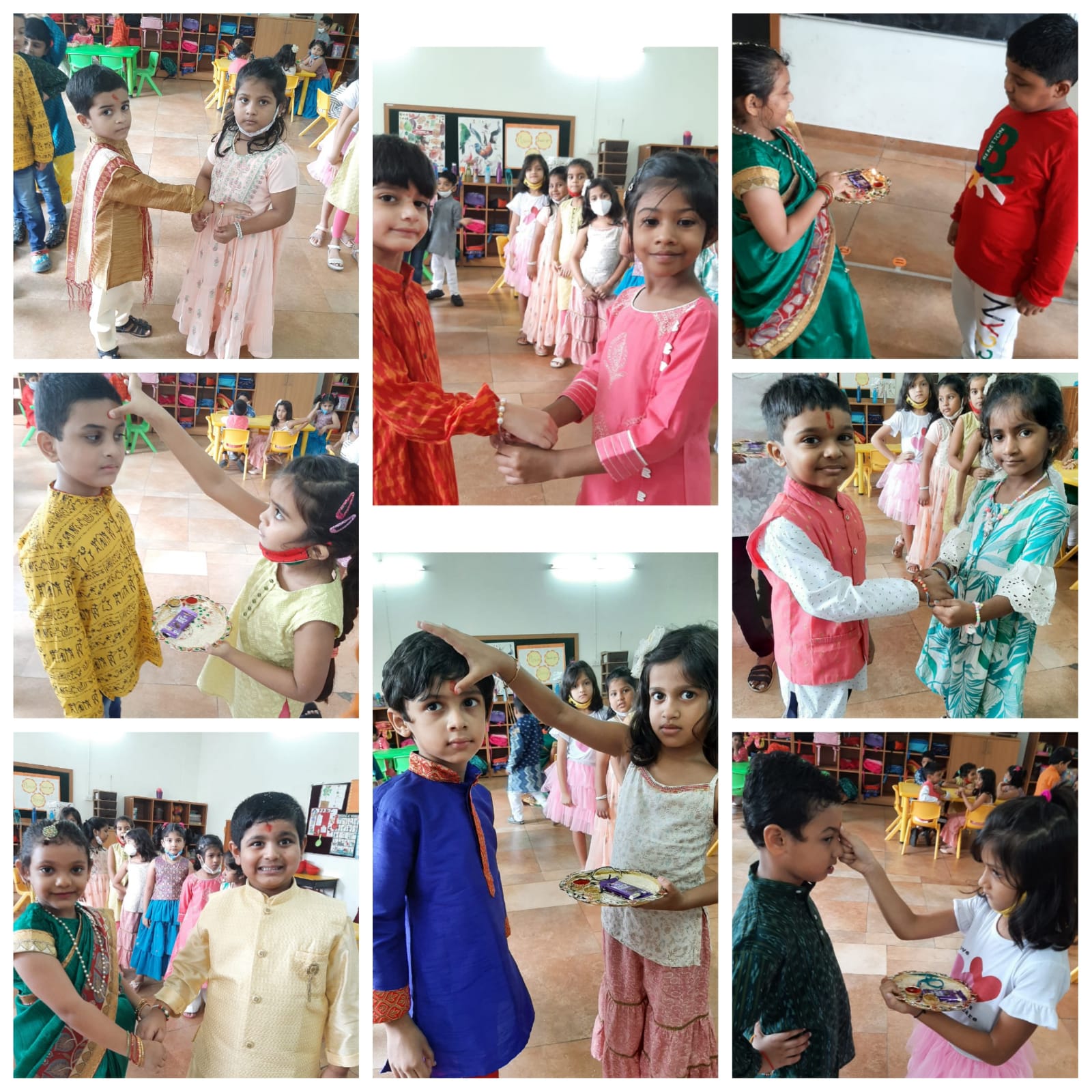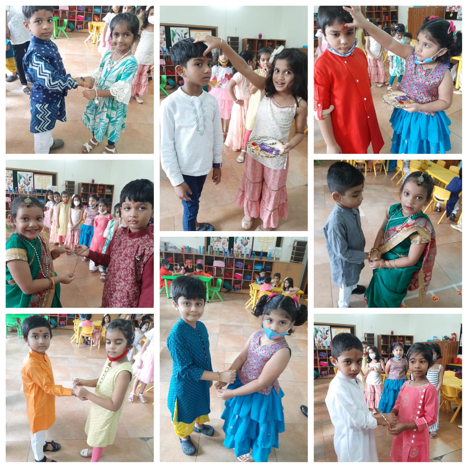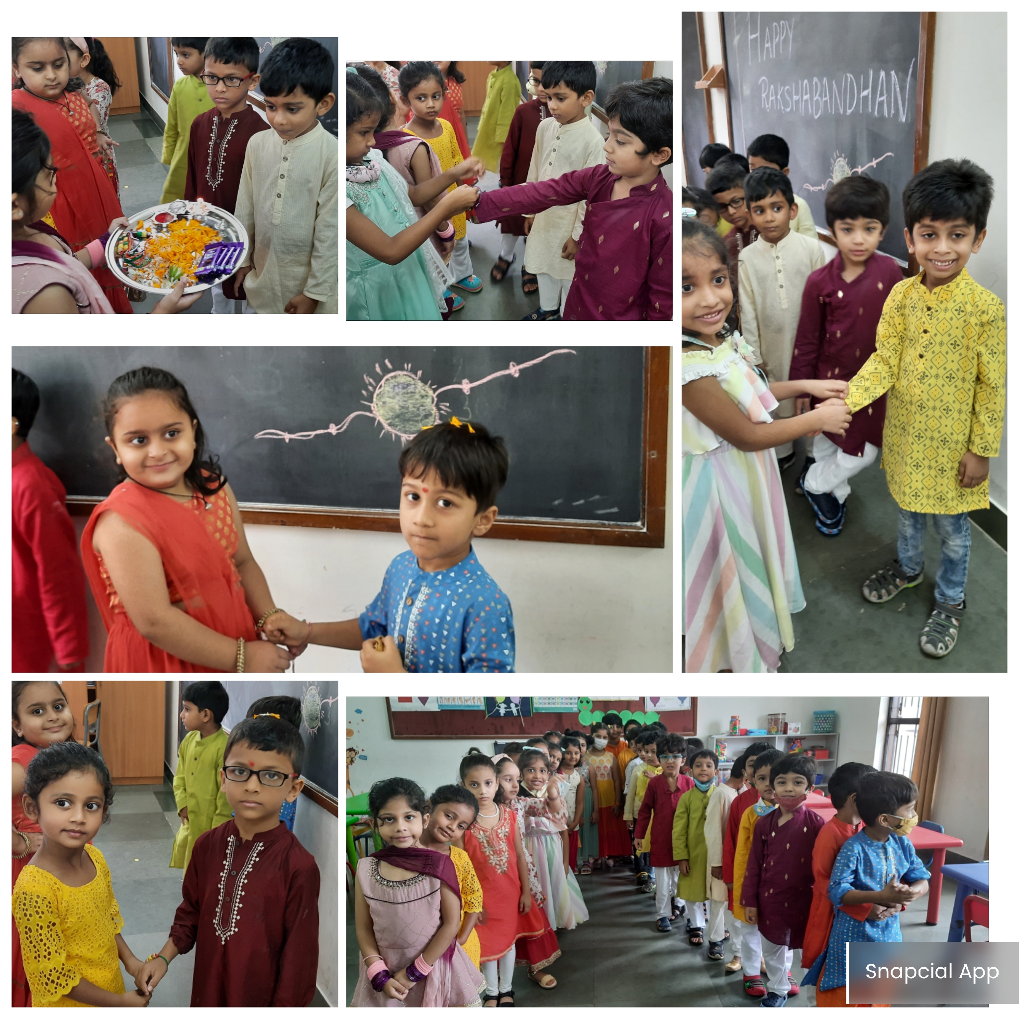 All students came dressed in Indian traditional outfits. The meaning of Raksha Bandhan was explained to the students by their class teacher. The handmade Rakhis crafted by the resource room students were tied on students' wrists and sweets were distributed to all.